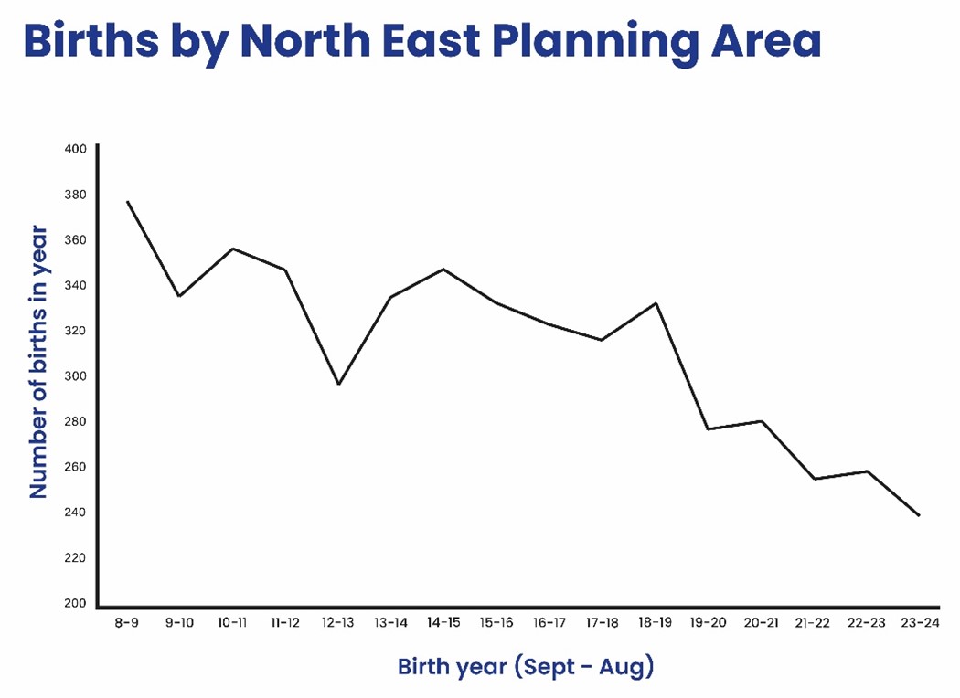 North Tyneside’s population is changing. Birth rates have fallen steadily since 2018/19 and there are now around 300 fewer children born each year. That’s the equivalent to 10 fewer classes annually.