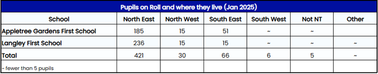 These tables show where the pupils attending Appletree Gardens First School or Langley First School, and where they live.