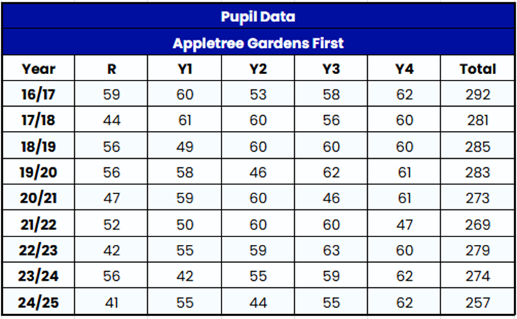 Appletree Gardens First School has a larger building, with 17 class base spaces (including existing school nursery rooms), therefore has more space for the relocation of pupils.