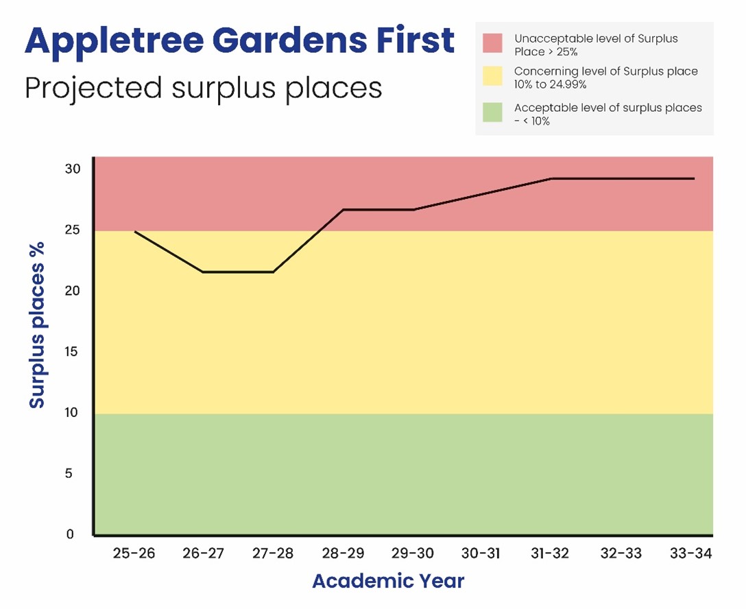 While currently both schools are in surplus (they receive more funding than they spend), Langley First is predicting a deficit (spending more than they receive) in 2026 which is projected to grow to £0.751m by 2028. At the same time Appletree Gardens is predicting it will enter deficit by 2028. School leaders have made changes and worked hard with the Council to make the financial situation better, but because low pupil numbers mean less funding, the situation is not improving. If left unchanged, the risk is that the two schools would continue to grow in deficit, and this in turn would limit their ability to sustain high quality education.