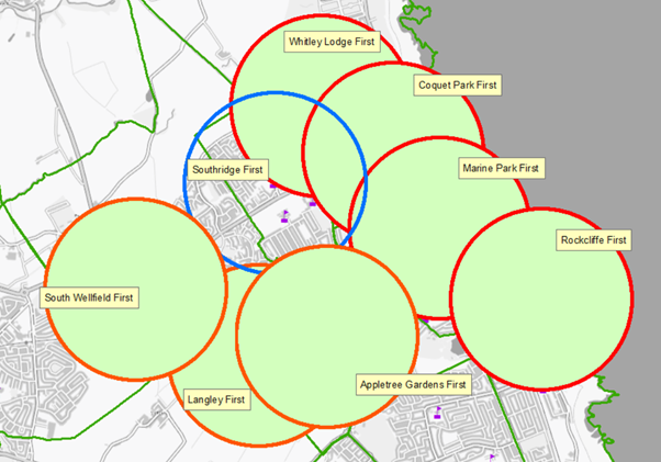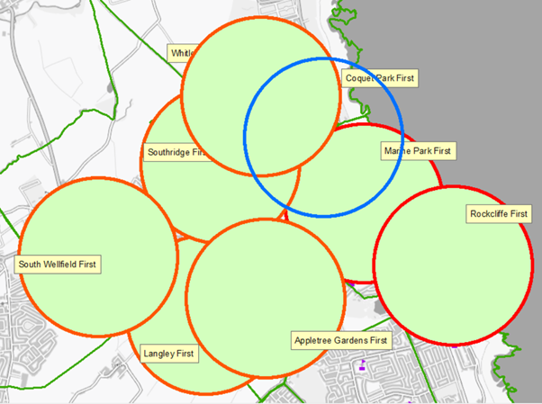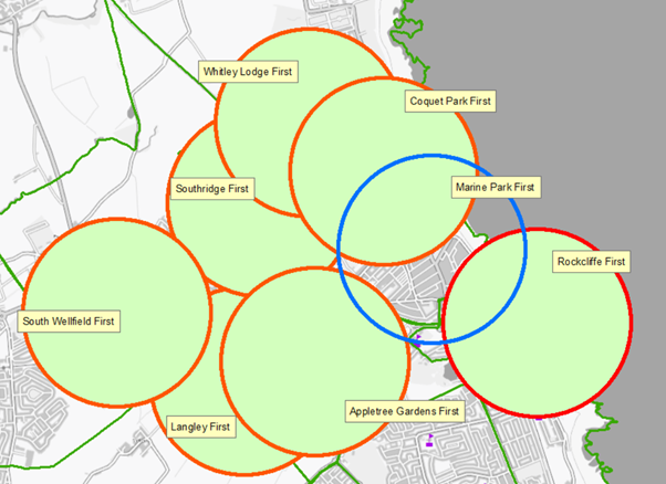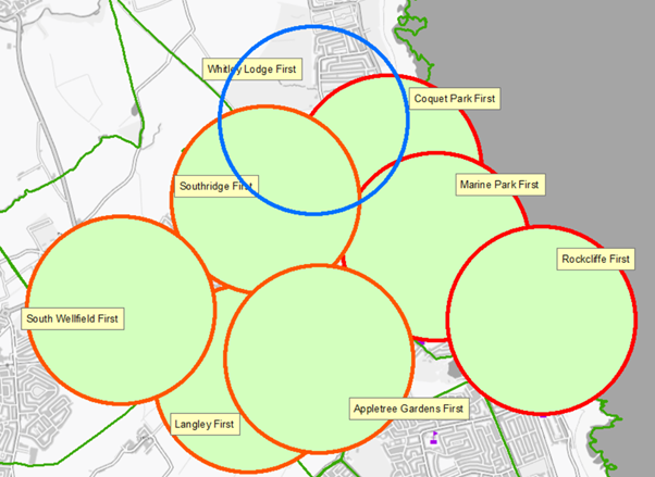 This map shows each of the eight First schools at the centre point of a circle with an 800m radius. If Marine Park First School were to close, it shows the houses that would be further than 800m from their nearest First school.