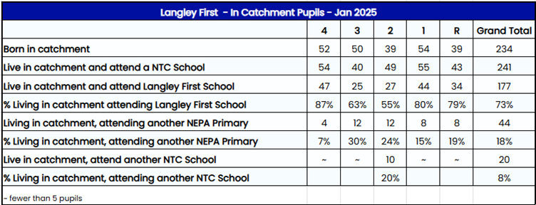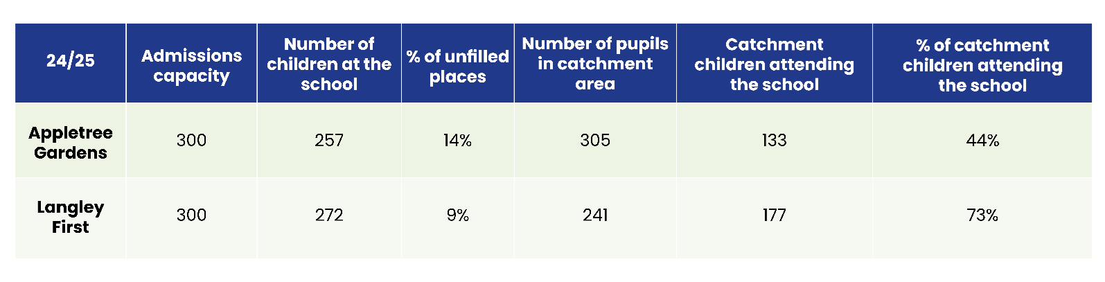 Langley First School has a smaller catchment with an average of 40 homes per planned place in catchment, when compared to Appletree Gardens Primary, at 44 homes per planned place and a borough average across first and Primary schools of 54. Retention of Langley First School rather than Appletree Gardens First School would mean that pupils in the eastern edge of Appletree Gardens First School would have 1,500m commute to a catchment school.