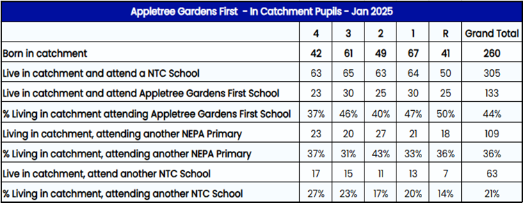 Appletree Gardens First School has a larger catchment, equating to 44 homes per planned place in catchment.