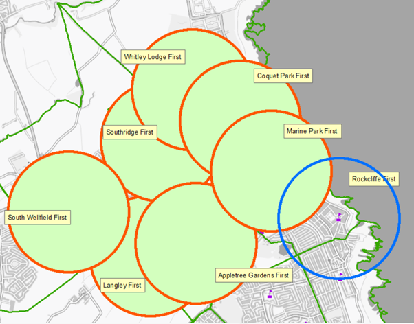 This map shows each of the eight First schools at the centre point of a circle with an 800m radius. If Rockcliffe First School were to close, it shows the houses that would be further than 800m from their nearest First school.