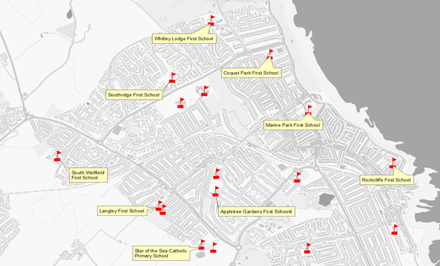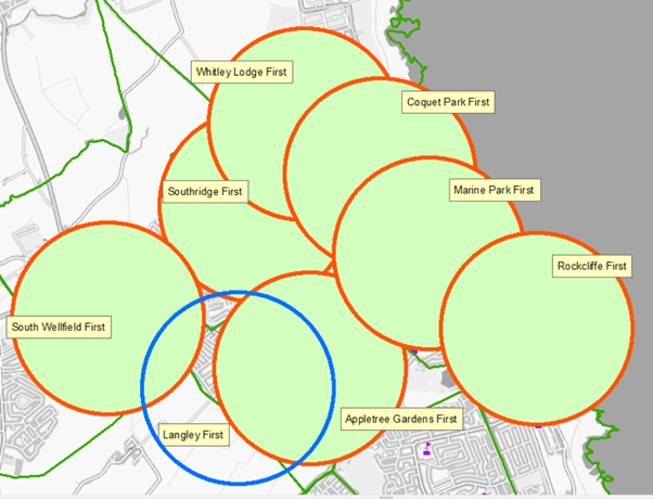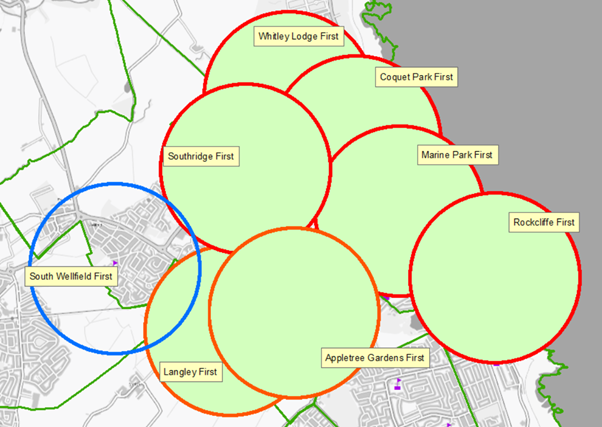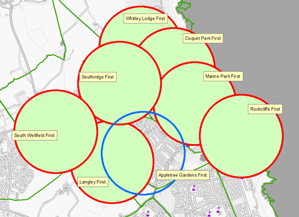 This map shows each of the eight First schools at the centre point of a circle with an 800m radius. If Whitley Lodge First School were to close, it shows the houses that would be further than 800m from their nearest First school.