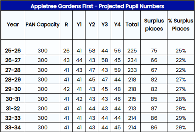 Close/merge another school with a PAN of 60 | Appletree Gardens First School See above for the rationale for not closing Appletree Gardens First School site - it has a larger building, with 17 class base spaces (including existing school nursery rooms), therefore has more space for the relocation of pupils.